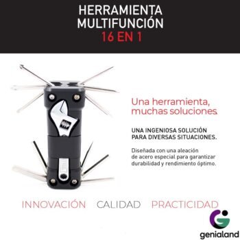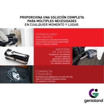 En el día a día, las situaciones imprevistas están a la vuelta de la esquina. ¿Cuántas veces has necesitado una herramienta específica y no la tenías a mano? Esta Multiherramienta 16 en 1 es la solución definitiva que elimina la necesidad de cargar con una caja pesada, concentrando toda la utilidad que necesitas en un diseño compacto.