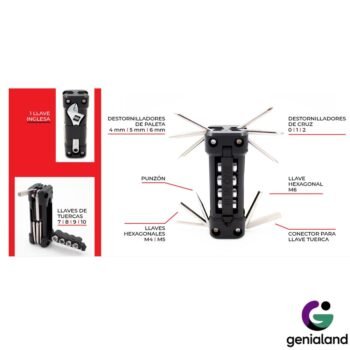 Mecanismo Multifunción 16 en 1: Incluye una selección de llaves Allen, destornilladores (cruz y paleta) y llaves de tuerca, cubriendo las necesidades más comunes de ajuste y reparación.