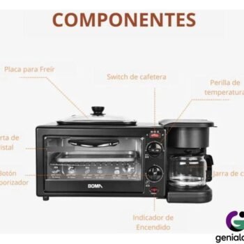 ¿Te falta espacio en la cocina o buscas optimizar tu tiempo por las mañanas? Preparar un desayuno completo suele requerir encender varios electrodomésticos, ensuciar de más y ocupar todo el mesón. Este Horno Eléctrico 3 en 1 es la solución definitiva que integra cafetera, plancha y horno tostador en una estructura compacta y elegante.